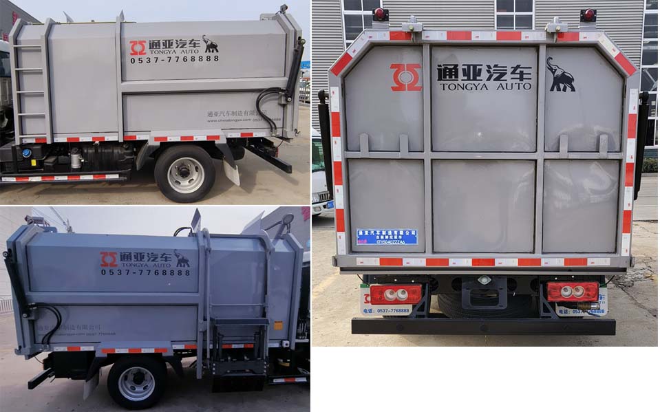 該車裝備有垃圾箱體及垃圾桶提升傾倒機構(gòu),用于將垃圾分類裝入、轉(zhuǎn)運和卸料;僅采用2850mm軸距;側(cè)后防護裝置材料均為Q235,與車架連接方式為焊接加螺栓連接,后部防護裝置的斷面尺寸為100mm×50mm,離地高度為370mm;選裝箱體樣式,選裝不同結(jié)構(gòu)的箱體后部樣式;卸料方式后卸,廂體頂部封閉,不可開啟;發(fā)動機Q23-115C60的油耗值為11.4L/100Km,發(fā)動機Q23-115E60的油耗值為11.4L/100Km;ABS系統(tǒng)控制方式為4S/4M,ABS型號為CM4XL-4S/4M,生產(chǎn)廠家為廣州瑞立科密汽車電子股份有限公司.選裝ETC車載裝置.整備質(zhì)量包含備胎、滅火器隨車工具重量.
